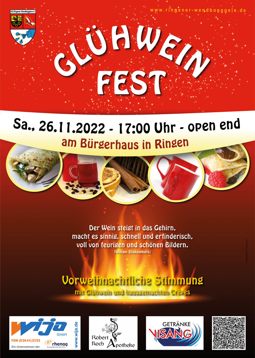 Es wird wieder kälter und die Tage kürzer. Es kommt die Zeit, in der man sich wieder darauf besinnt, was wirklich wichtig ist: Zeit mit Freunden und Familie zu verbringen, "Quality-Time" genießen und den Winter willkommen heißen. Das alles möchten wir feiern, mit unseren Freunden und Nachbarn, bei einem heißen selbstgemachten Glühwein oder Fruchtpunsch. Höchste Zeit also, sich den Termin für unser traditionelles Glühweinfest am Samstag vor dem 1. Advent vorzumerken. Es erwartet Euch vorweihnachtliche Stimmung mit verschiedenen heißen Glühweinen, Fruchtpunsch, hausgemachten Crêpes und Bratwurst - ganz ungezwungen und "ohne Protokoll" - draußen am Lagerfeuer oder lieber drinnen.